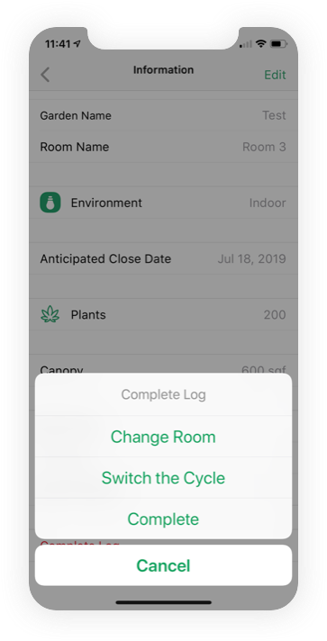 - •To complete the grow log or switch growth-phase, simply press on the “info” icon then tap “complete.”